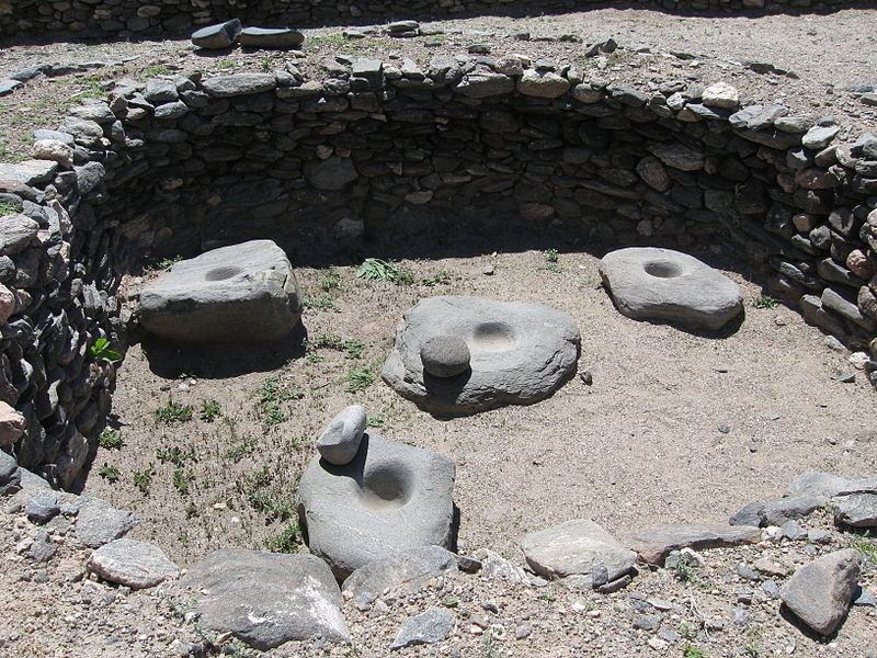 The two most striking features of the Quilmes ruins are the scale of the settlement, occupying a walled area of approximately 30 hectares, and the pukará, or hill-fortress, directly behind it to the west. The pukará faces eastward and consists of two steep hills cleft by an even steeper gorge, or quebrada. The enclosed settlement directly below and to the south of the pukará was known as the ‘City of Peace’; within it the Quilmes are thought to have lived and kept their livestock – llama, guanaco and vicuña – and to have cultivated maize and wheat among other crops. Agriculture was made possible by canaling water from a river issuing from the Cumbres Calchaquíes mountain range to the northeast. The large number of granaries and mortar stones found at the site, both inside and outside the enclosure, give us an idea of the scale of agricultural production needed to support the settlement’s increasing population, estimated to have reached at least 3,000 by the early 17th century.
