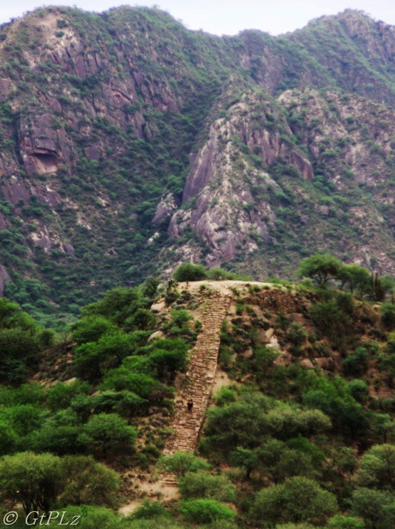 The second ceremonial mound, standing symmetrically in line with the first, has well-preserved steps leading to its summit, or platform. The Diaguita people, or more probably their Inca overlords, must have possessed a rudimentary system of geometry; each step cut into the mound has, roughly, the same height and depth (20 – 30cm). There are a total of 100 steps. There may even have been a double step every 12 steps or so, to allow for breaks during the steep ascent. Only vague traces remain of these ingenious ‘base camps’, largely obliterated during the mound’s “reconstruction”. Pirká walls were built into the sides of both mounds to prevent erosion.